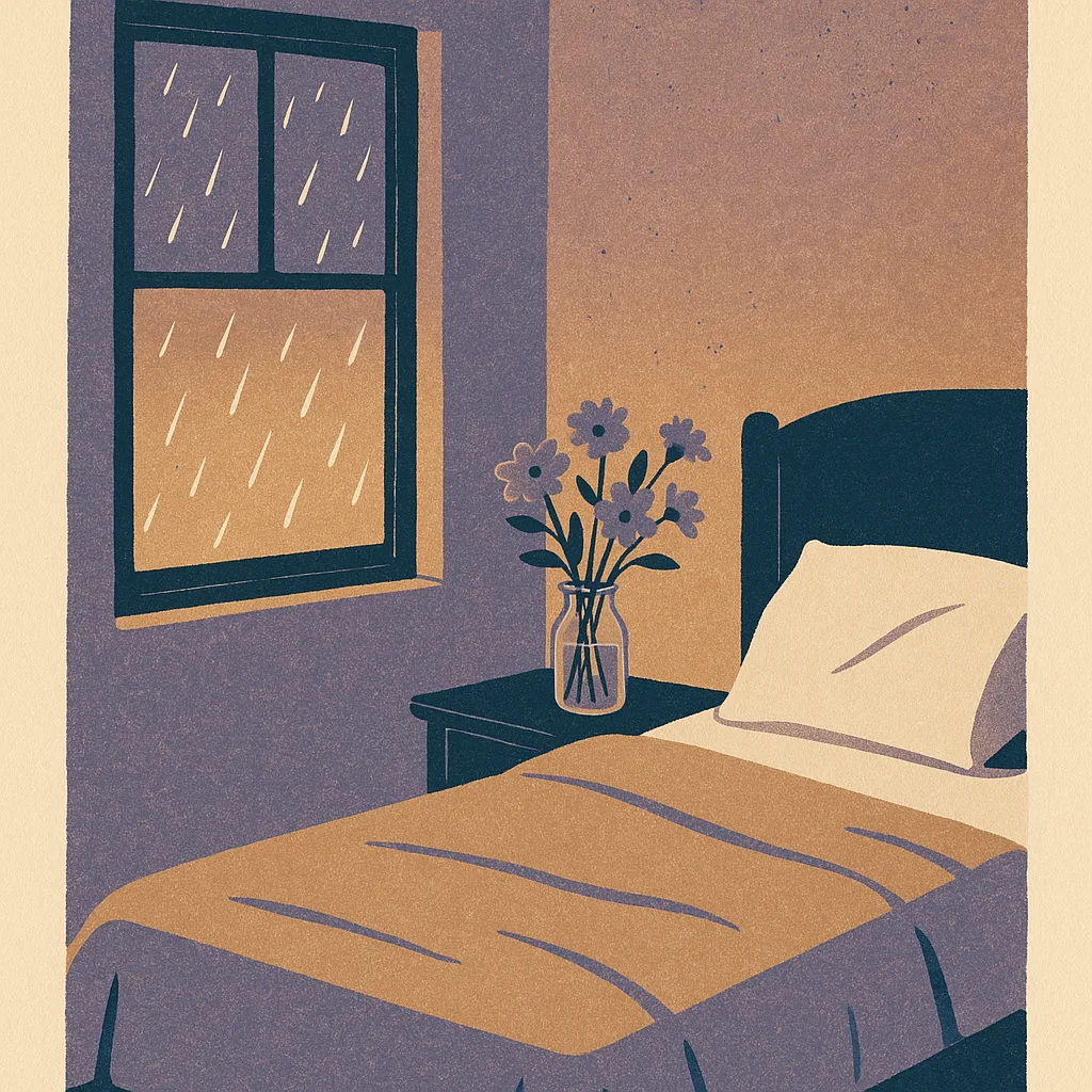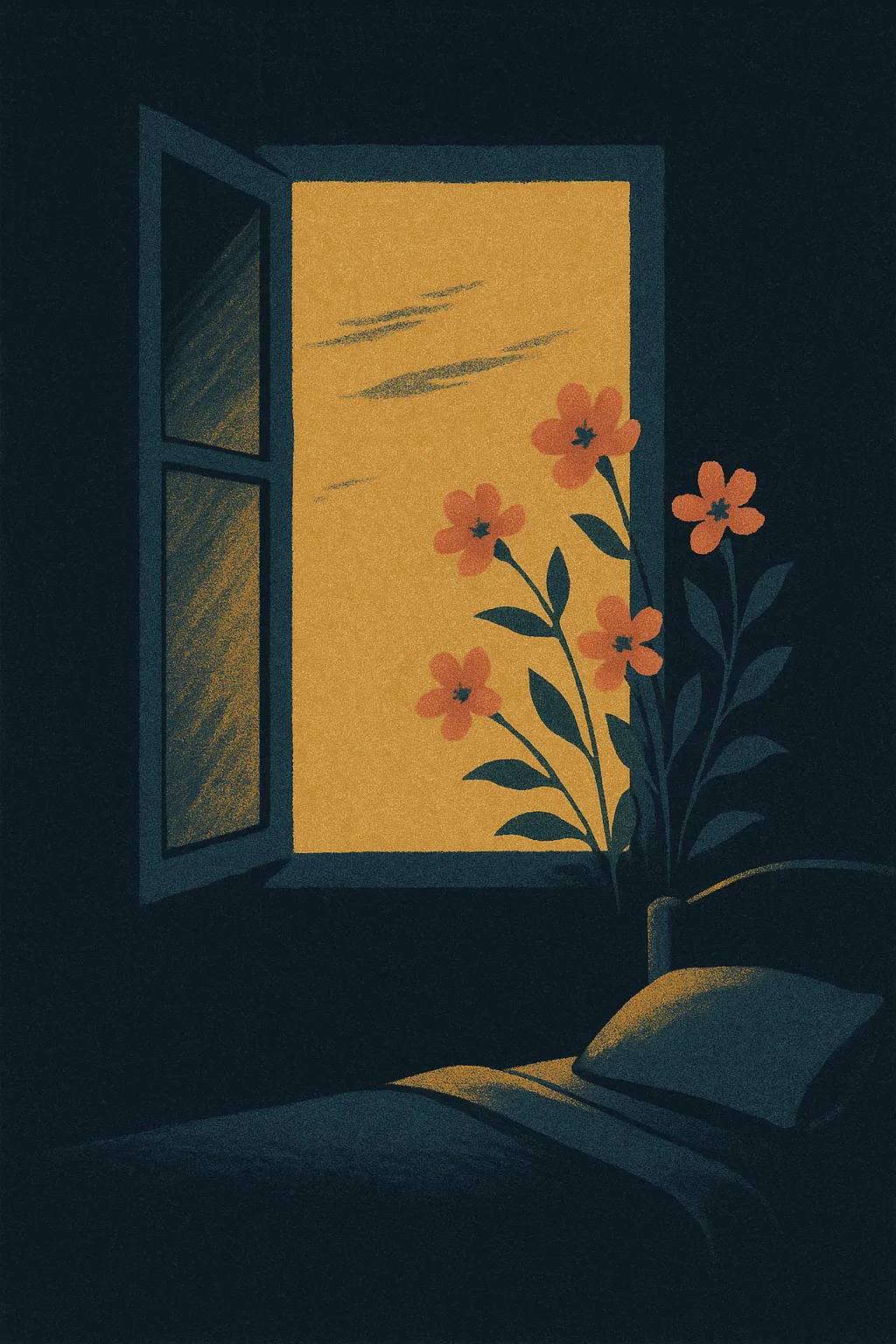 A darkened bedroom, the air heavy with the gradual acceptance that life is different now. More simple. More bare. It’s joyful in its own heartbreaking way. Never again will I look at this room like it’s the place where great dreams are born. It’s now the place that holds me gently, that comforts me, that wishes me nothing but one night’s sound sleep. The painting on the wall is of a single daisy, simple, like my soul now. The window slightly ajar lets the perfume inside from dark blue flowers lingering in the moonlit garden. Sleep is waiting for me here.